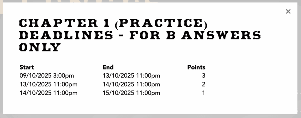 If you click on a challenge that hasn’t started yet you will get a pop up showing the deadlines for that challenge. Actually we don’t take speed into account when marking part A challenges, so the points schedule only applies to part B submissions. Both parts are marked for accuracy though, so your score for part A will be a percentage accuracy, while your score for part B will be a pair (%,t) where % is your accuracy score and t is your speed score.