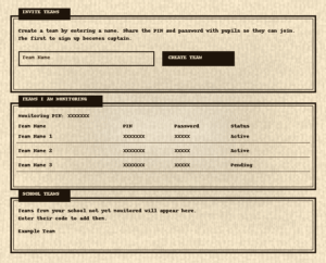 - Alternatively, the pupils can setup their own teams and add you as a team monitor by entering your Monitoring PIN into the team page on the Team Captain’s account area. You won’t know the team has been setup until they do that, but when they do it too will appear under the “Your Teams” tab in your teacher account area.